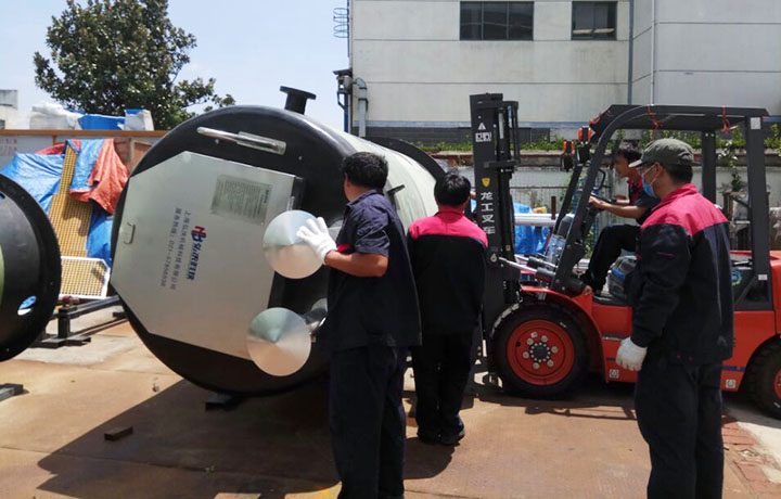 上海一體化泵站廠家弘泱科技的小伙伴們,在吊裝前已經準備就緒,他們或開叉車、或指導搬運、或準備筒體下面防治的沙袋等。